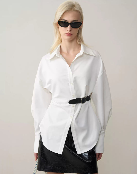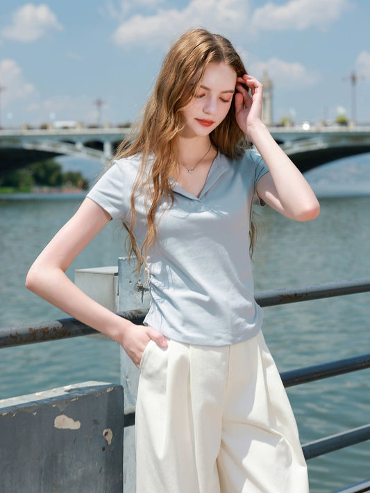 Tencel-Linen V-Neck Tie Blouse with Bell Sleeves
