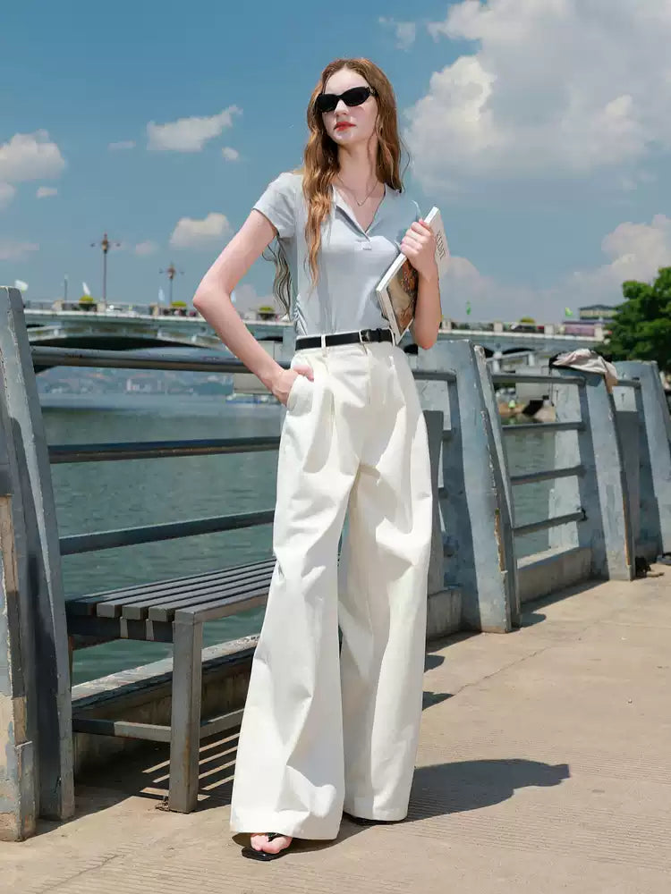This blue collared short sleeve top is a classic staple. Made from a soft and stretchy cotton-blend fabric, its fitted silhouette is both comfortable and flattering. Pair it with jeans or a skirt to effortlessly create a polished and confident look.