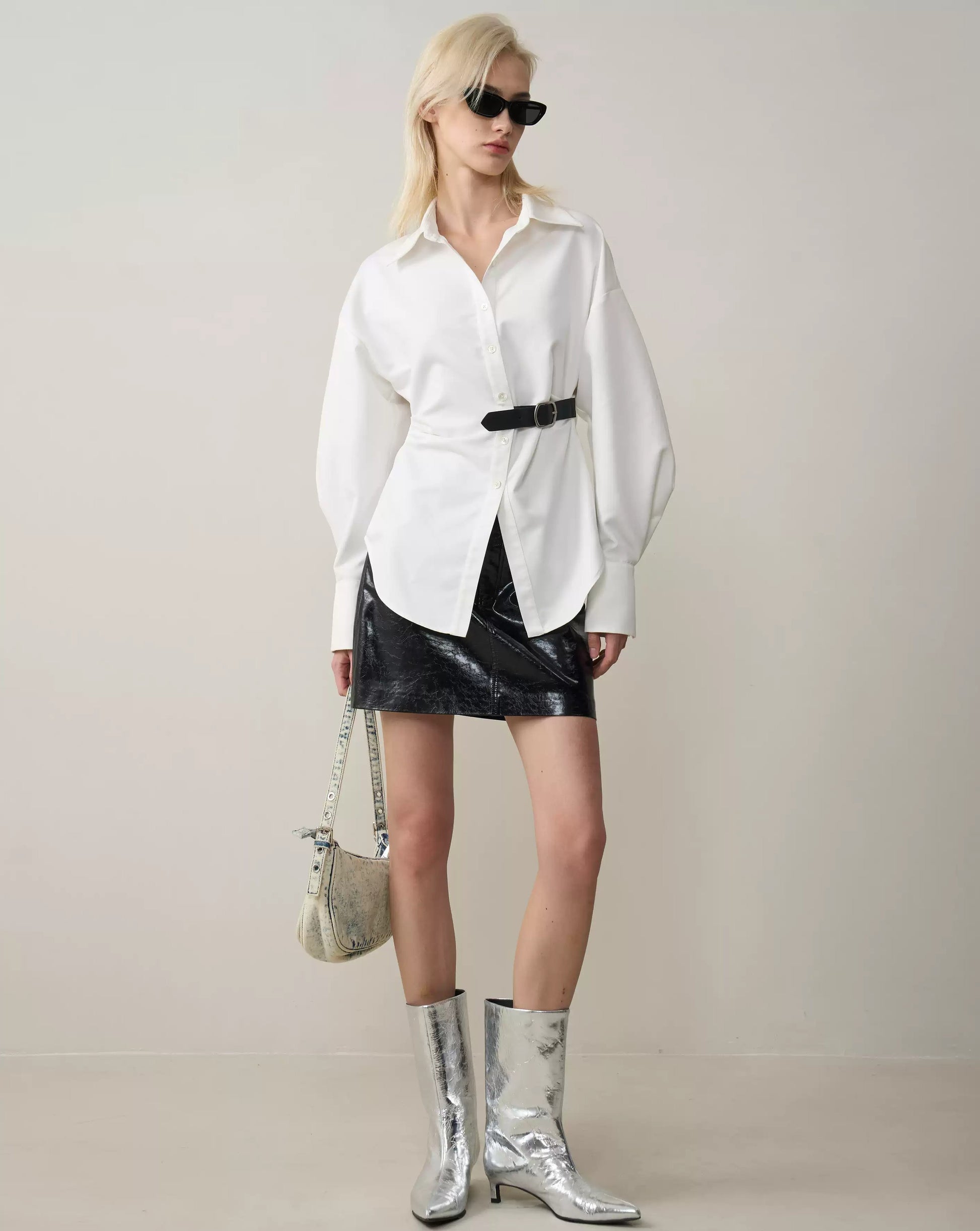 This white belted-waist shirt is an essential for creating a simple, elegant style. Made from a lightweight, crisp cotton fabric, it's comfortable, breathable, and perfect for spring. The unique belted design subtly cinches the waist to create a flattering silhouette, making it an ideal choice for both professional and casual occasions.